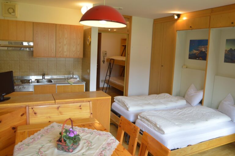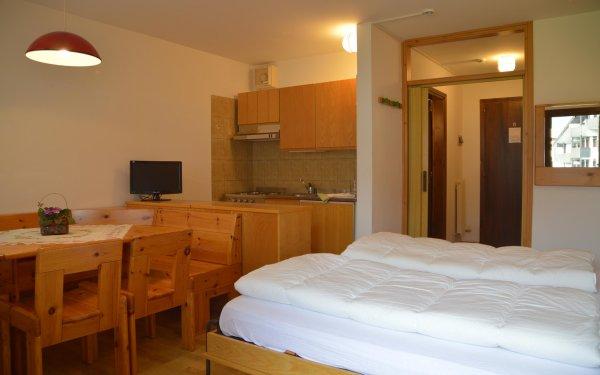 Monolocale adatto per 2 adulti e 1 o 2 bambini, è composto da un ingresso con un letto a castello, soggiorno con angolo cottura e 2 letti singoli a scomparsa, bagno con doccia e balcone vista boschetto.