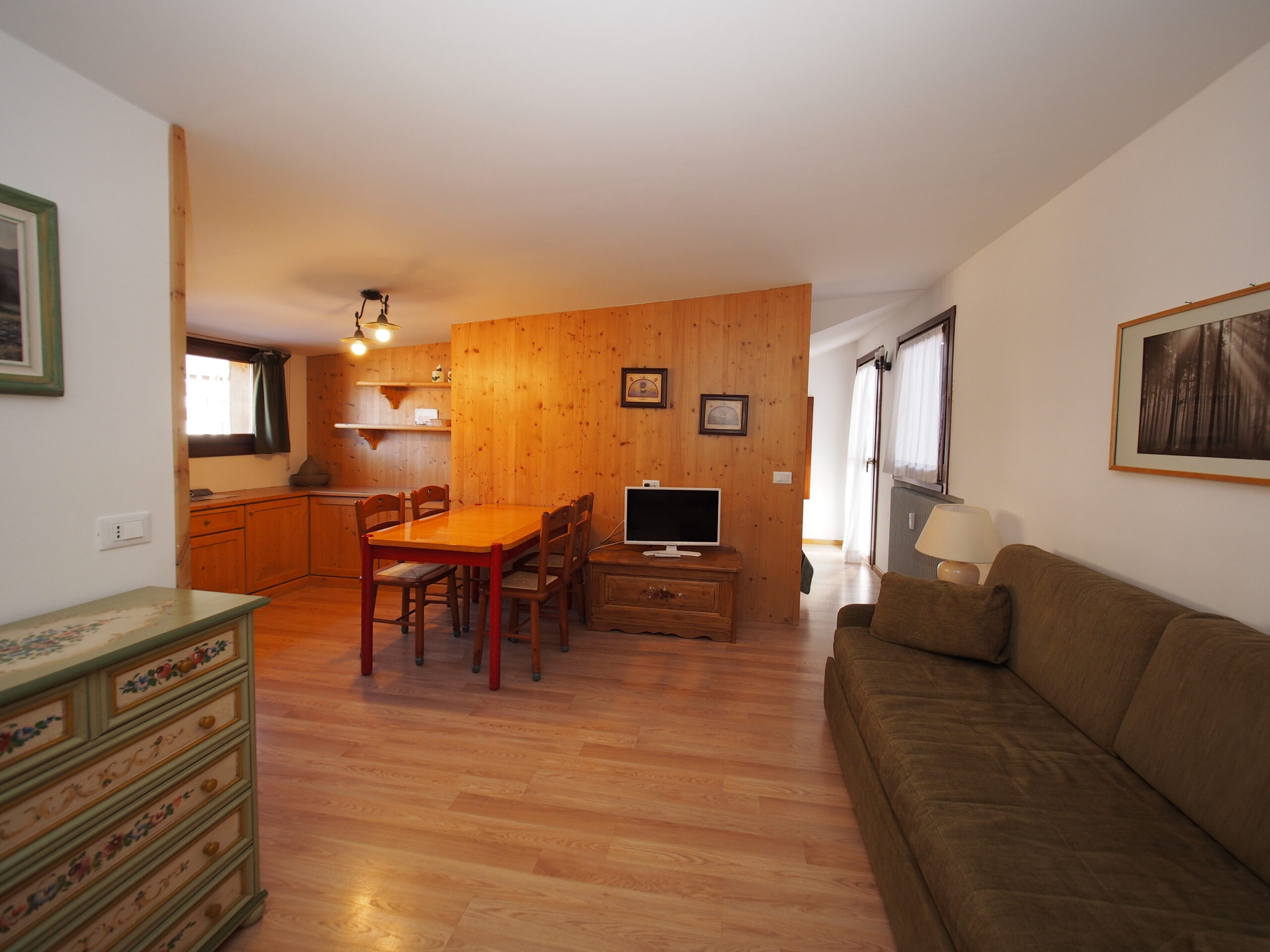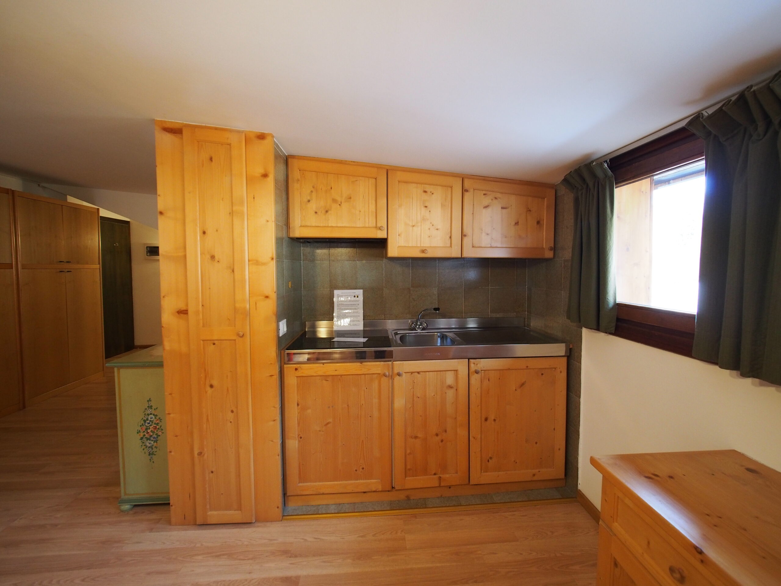 Mansarda al Residence Erica Centro Thule, al quarto piano del fabbricato dotato di ascensore, vendiamo questo piccolo appartamento composto da un soggiorno con angolo cottura e una parete divisoria che nasconde due letti piani, un bagno finestrato, un piccolo ripostiglio ed una cantina al piano interrato, inoltre l’appartamento ha un terrazzo di 8 mq (3×2,70) con vista sul Pelmo.